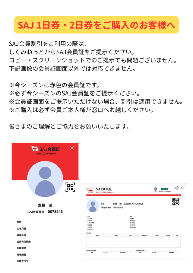 ※リフト券購入の際、SAJ会員様は本年度の会員証、シニアの方は身分証明書、障害者の方は障害者手帳をご提示下さい。