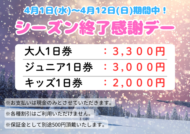 ※シニア・SAJ・子供券・時間券・回数券は対象外です。